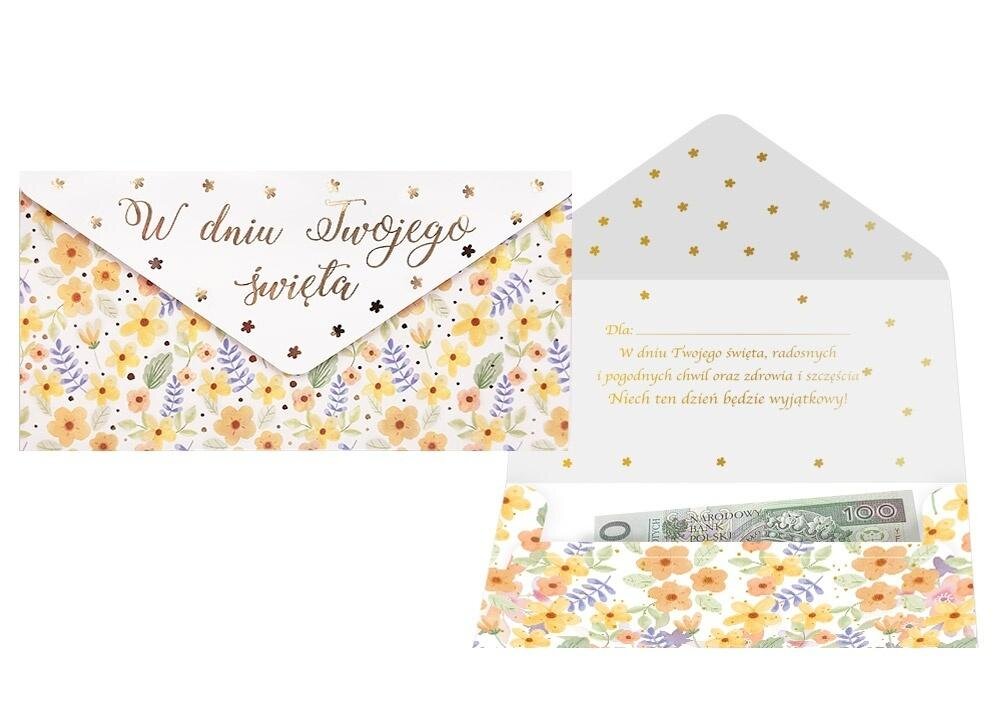 Koperta podarunkowa KOP-015 "W dniu Twojego święta" Koperta podarunkowa jest eleganckim sposobem na podarowanie bliskiej osobie banknotu lub karty podarunkowej. Koperta jest kolorowa i uszlachetniona metalizowaną folią hot-stamp, jest solidnie wykonana i wyposażona w rzep, co umożliwia jej...