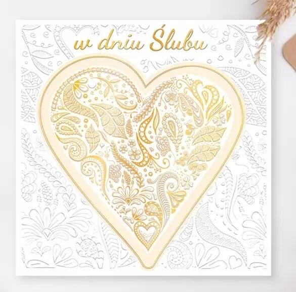 Karnet kwadratowy 15 x 15 cm. Złocony i tłoczony, teksy życzeń w środku. Wydrukowany na wysokiej jakości papierze. W zestawie koperta. przeczytaj całość
