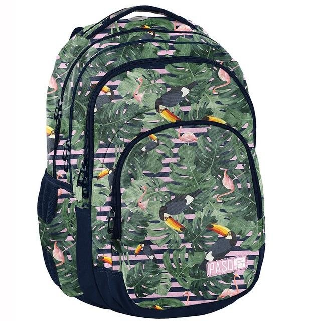 Plecak młodzieżowy, szkolny. Trzy pojemne komory, kieszeń przednia z organizerem, 2 boczne kieszenie z siatki. Wzmocnione profilowane plecy evafoam miękkie wygodne szelki. Wygodny uchwyt do przenoszenia i uszko do powieszenia. W komorze głównej przegroda (na laptop), w drugiej komorze organizer z kieszenią na zamek oraz uchwyt na klucze. Elementy odblaskowe dla większego bezpieczeństwa.
