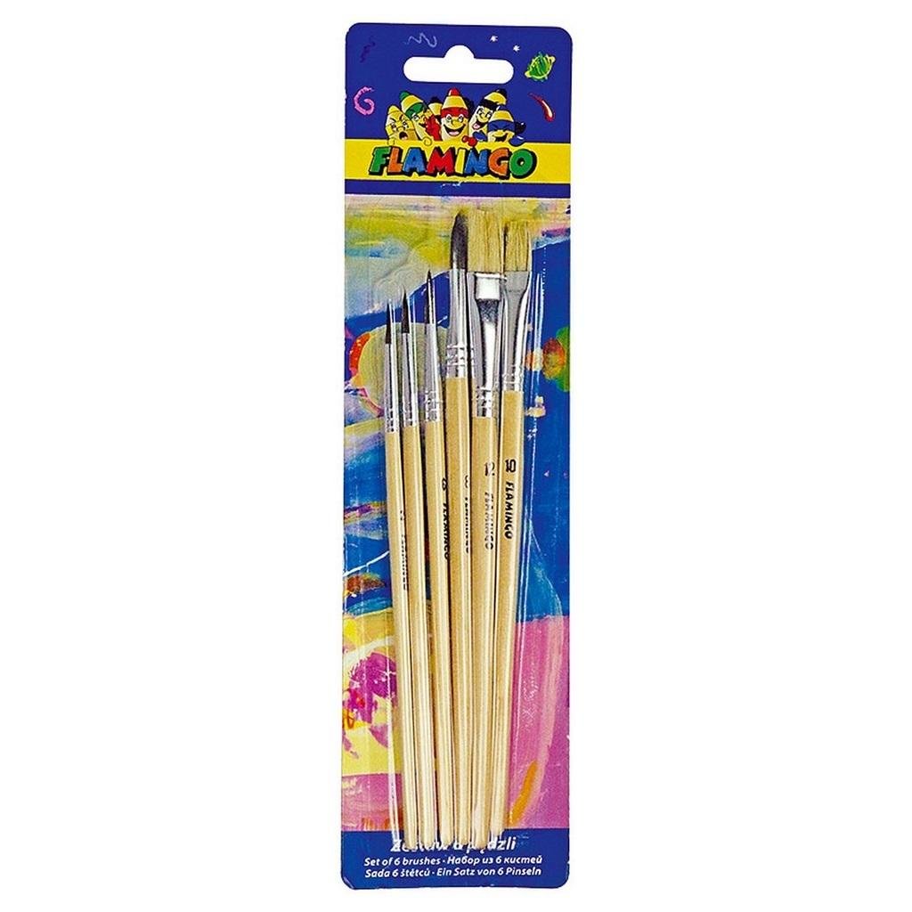 Zestaw 6 pędzli z naturalnym włosiem. Wytrzymałe drewniane uchwyty z oznaczeniem grubości. Pędzle sprawdzą się idealnie zarówno na zajęciach malowania farbami w szkole, jak i w domu. Zestaw zawiera 6 pędzli: 2 płaskie i 4 okrągłe. Pędzle okrągłe o grubościach: 2 mm, 4 mm, 6 mm i 8 mm. Pędzle płaskie o grubościach: 10 mm i 12 mm. Pakowane na blistrze. Zestaw zawiera 6 pędzli: 4 płaskie i 2 okrągłe.