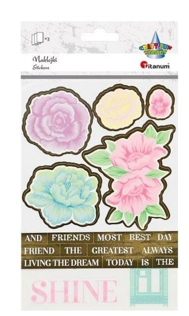 Naklejki zestaw 3 plansz:1. papierowe naklejki 3D kwiaty2. papierowe białe napisy na złotym tle (wysokość naklejki 10mm)3. foliowe przezroczyste naklejki napisy+okna przeczytaj całość