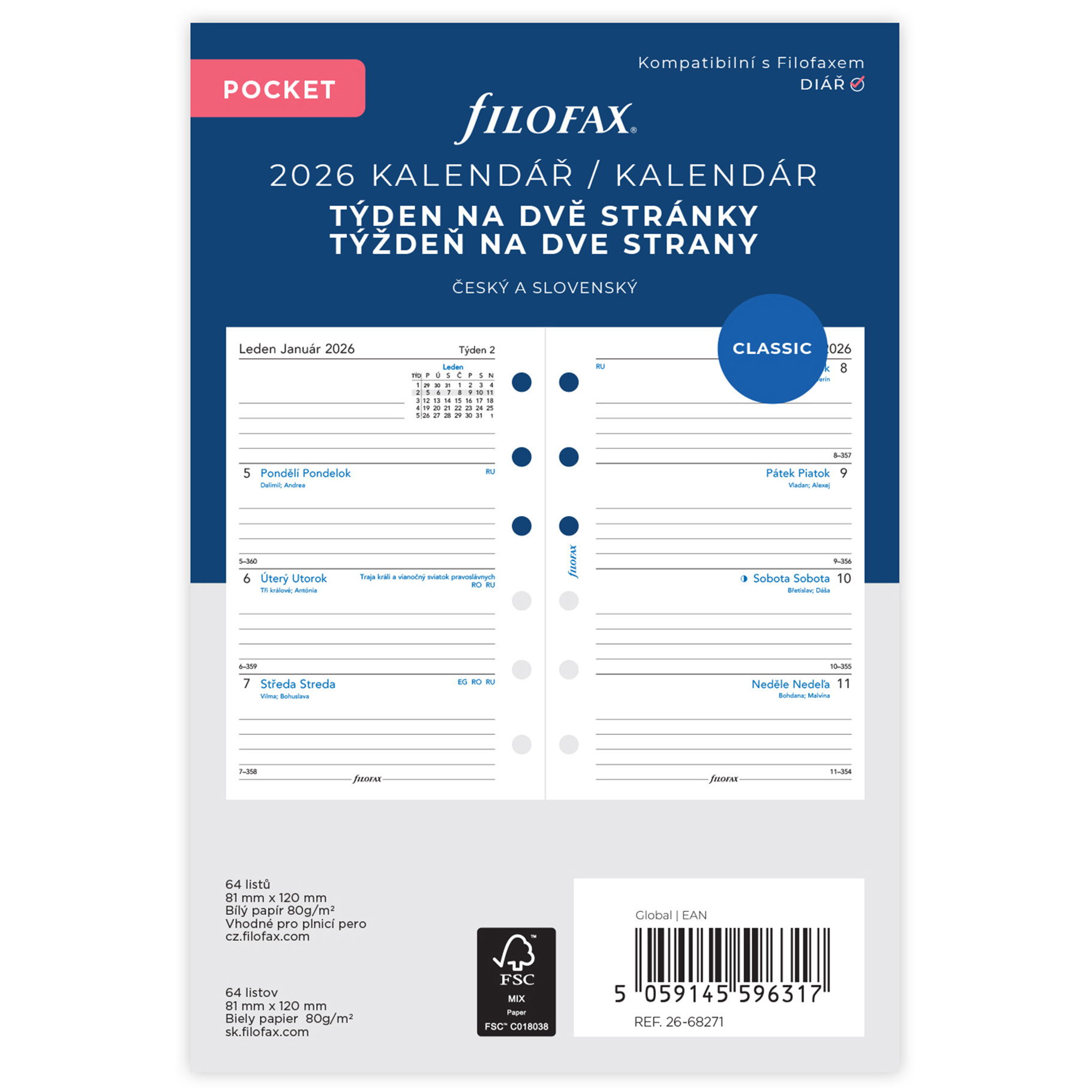 kalendář 2026 kapesní, týden/2 str, linky, ČJ+SJ