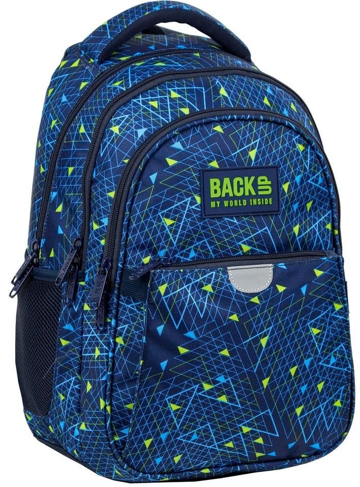 Geometryczne zielone wzory na niebieskim tle. Rozmiar idealny dla pierwszoklasistów. Nazwa wzoru: trójkąty.Wnętrze:- 3 komory- przednia poszerzana kieszonka na zamek- 2 boczne kieszenie na bidon- w pierwszej komorze 2 dodatkowe kieszenie- w przedniej kieszeni poręczny organizer dodatkową z...