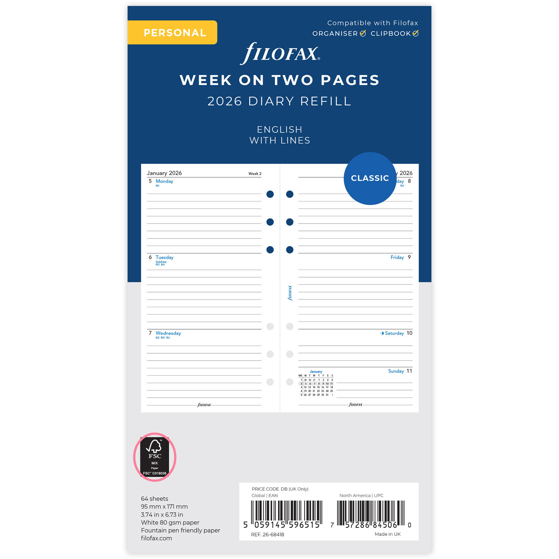 Filofax, Kalendář 2026 osobní, týden/2 strany, linky, AJ