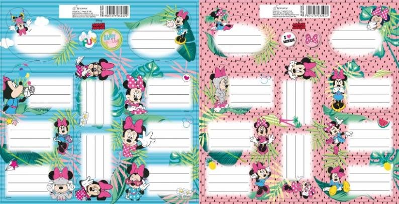 Naklejki na zeszyty z Myszką Mini. 2 arkusze - każda naklejka z miejscem na wpisanie imienia, nazwiska oraz przedmiotu szkolnego. przeczytaj całość