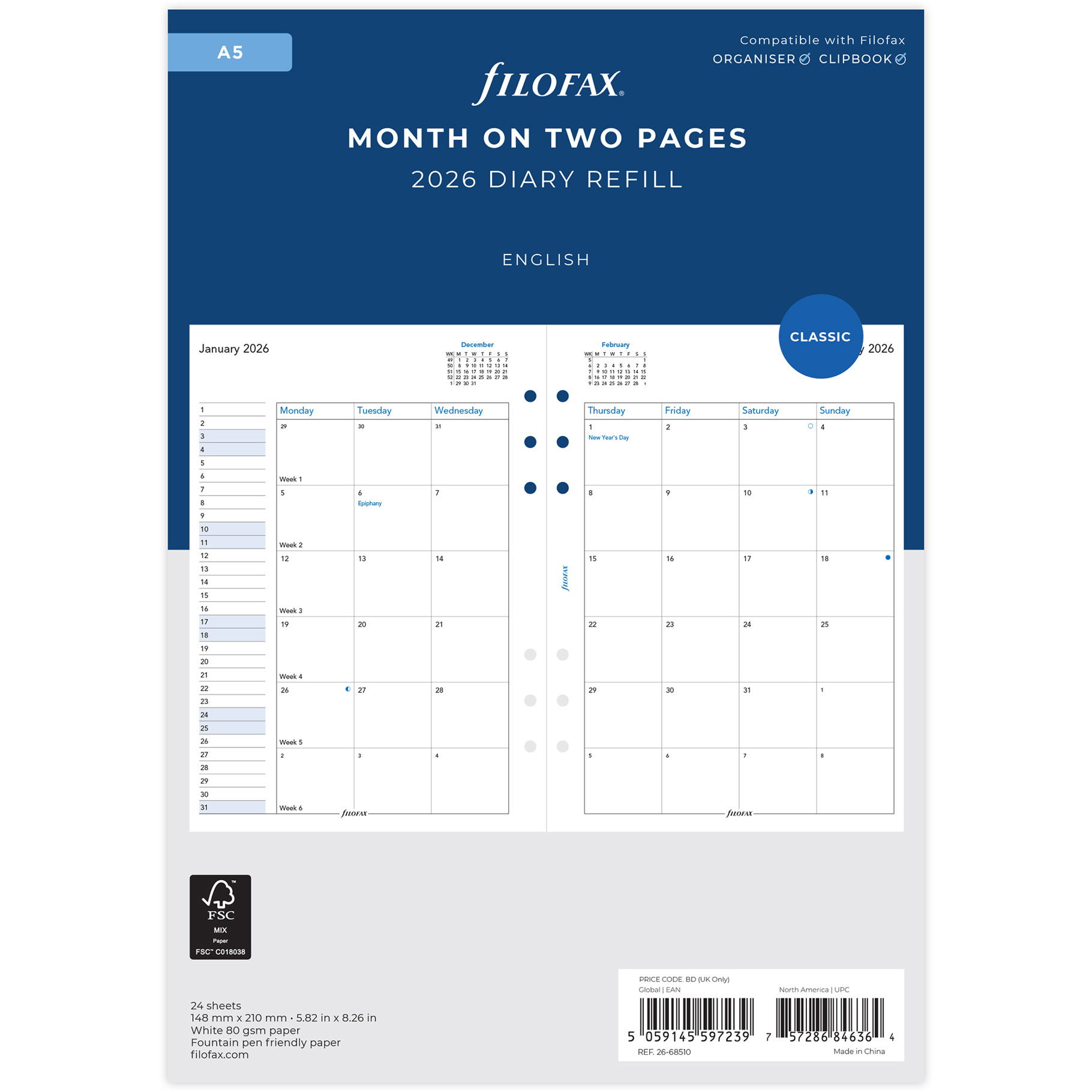 Filofax, Kalendář 2026 A5, měsíc/2 strany, AJ