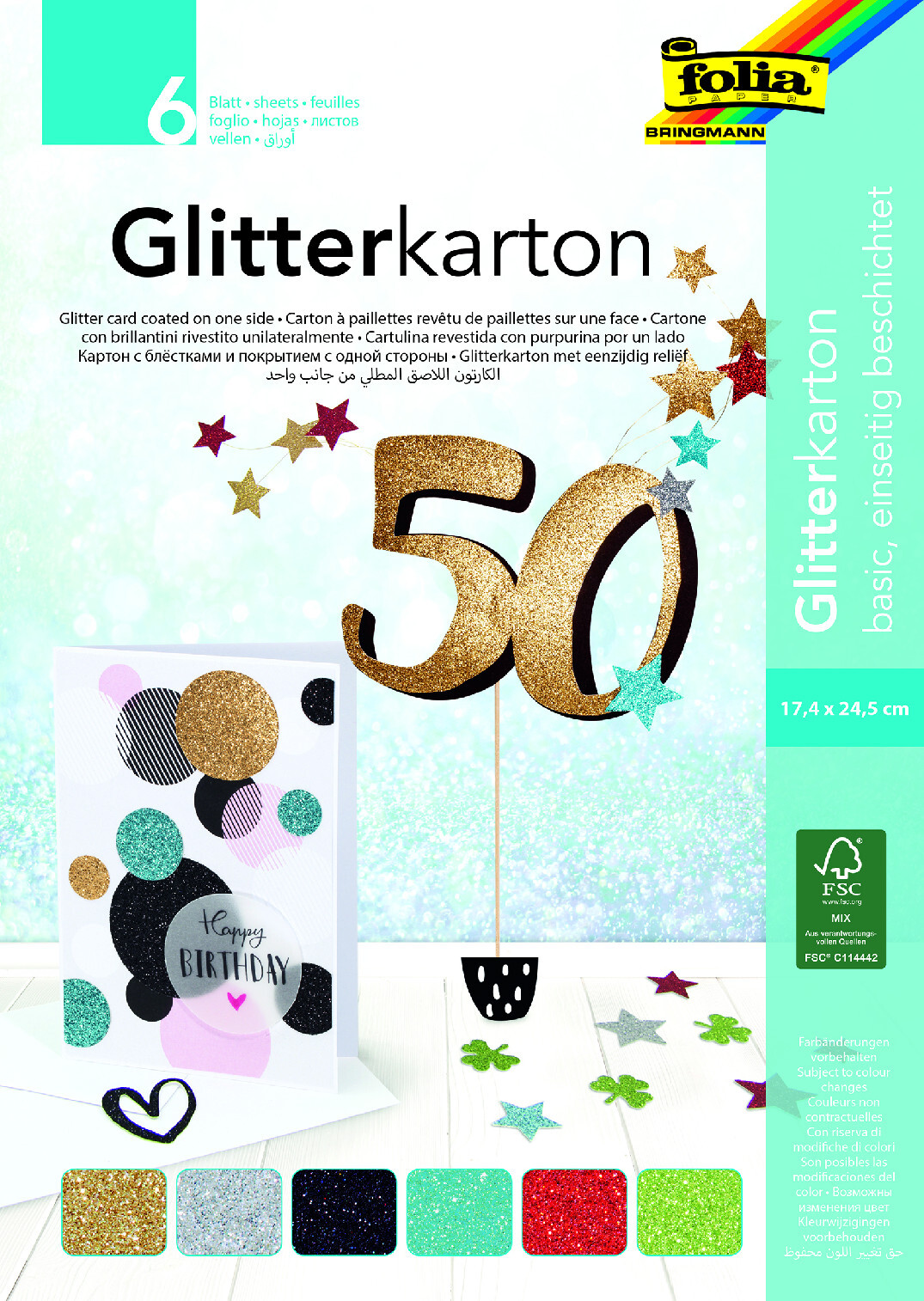 Barevný papír se třpytkami, 17,4 x 24,5 cm 6 listů