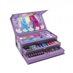 Zestaw przyborów dla małego artysty zapakowany w ozdobne pudełko-kuferek.Ma rączkę do wygodnego przenoszenia i 2 wysuwane szufladki.Zestaw zawiera:8 kredek ołówkowych8 kredek świecowych8 pisaków12 farbek wodnychpędzelekgąbeczkę2 gumki do mazaniaołówek- kolorowankę w formie notesika przeczytaj całość