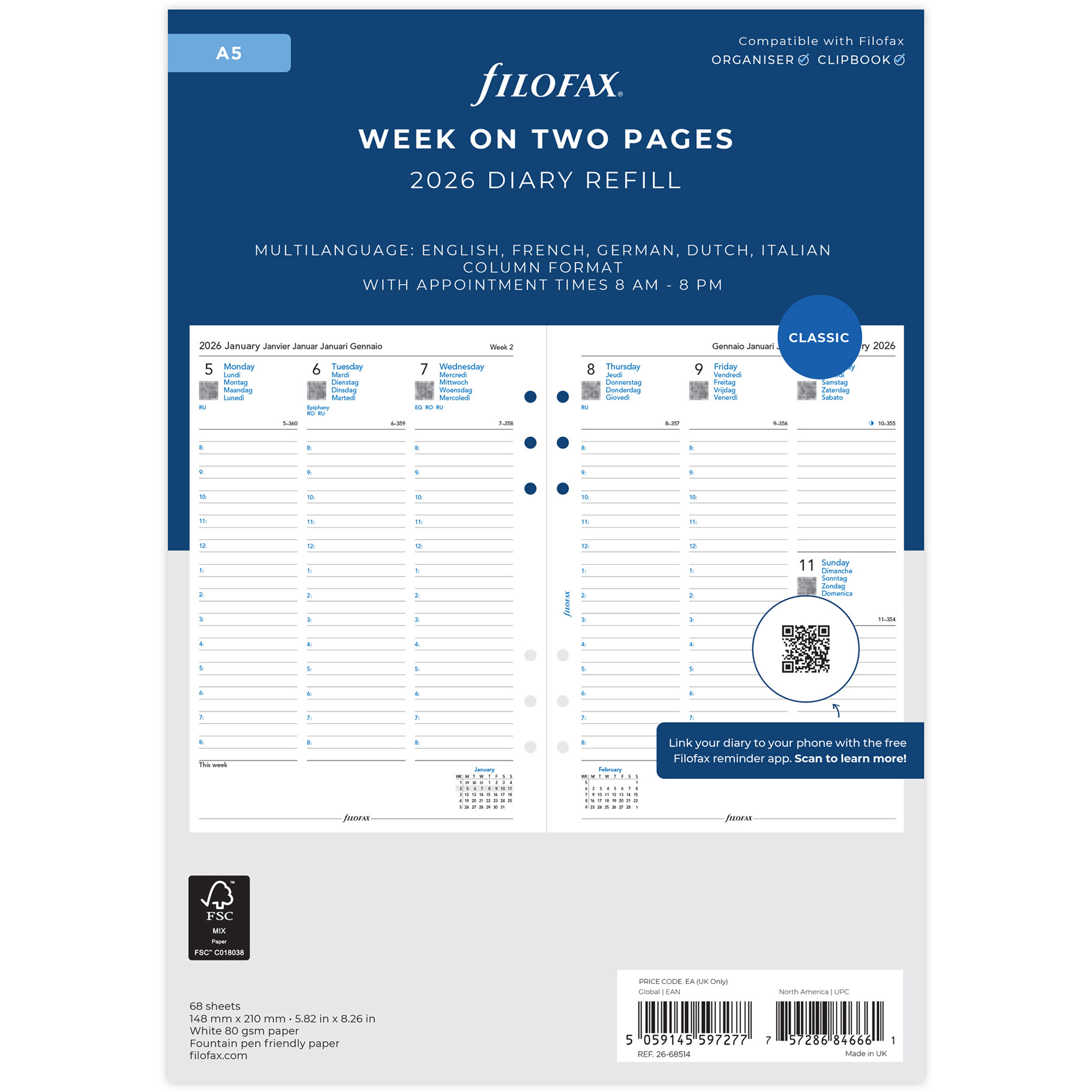 Filofax, Kalendář 2026 A5, týden/2 strany, sloupce, 5 jazyků