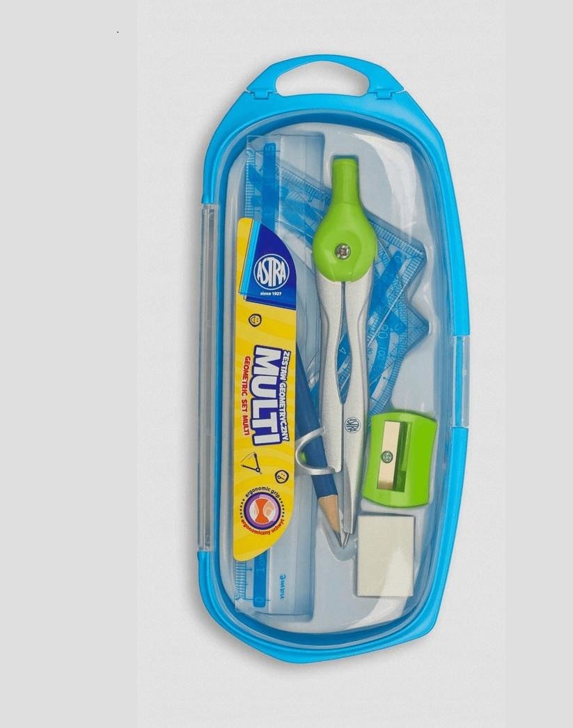 Zestaw geometryczny zawierający cyrkiel, linijkę, ekierkę, kątomierz. przeczytaj całość