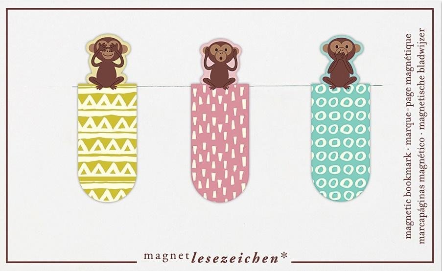 Zakładki Magnetyczne - Małpki. Pięknie ilustrowane zakładki z wystającymi, ozdobnymi elementami. Idealne do zaznaczania ostatnio czytanych lub ulubionych fragmentów książek. Doskonale sprawdzają się w indeksowaniu notatek, dokumentów w biurze, w szkole i w domu. Każdy zestaw zawiera 3 zakładki o różnych wzorach, skoordynowanych tematycznie.