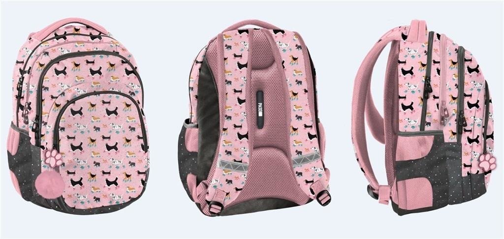 Plecak szkolny. Trzy pojemne komory, kieszeń przednia z organizerem, 2 boczne kieszenie z siatki+materiał. Wzmocnione profilowane plecy, miękkie wygodne szelki. Wzmocniony i usztywniony spód. Wygodny uchwyt do przenoszenia i uszko do powieszenia. W komorze głównej przegroda (na laptop), w drugiej komorze organizer z kieszenią na zamek, uchwyt na klucze. Elementy odblaskowe dla większego bezpieczeństwa.