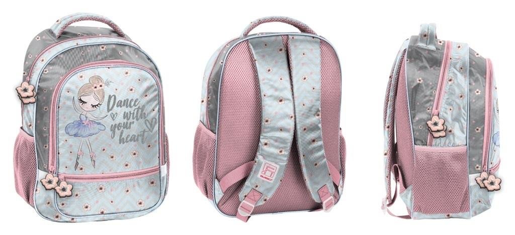 Plecak dwukomorowy szkolny, jedna płaska mała kieszeń na froncie, dwie boczne kieszenie z siatki (mieszczą małą butelkę, bidon lub termos). Elementy odblaskowe, usztywnione plecy pokryte siatką. Wygodny uchwyt do przenoszenia. Wygodne pullery ułatwiające odpinanie zamków. przeczytaj całość