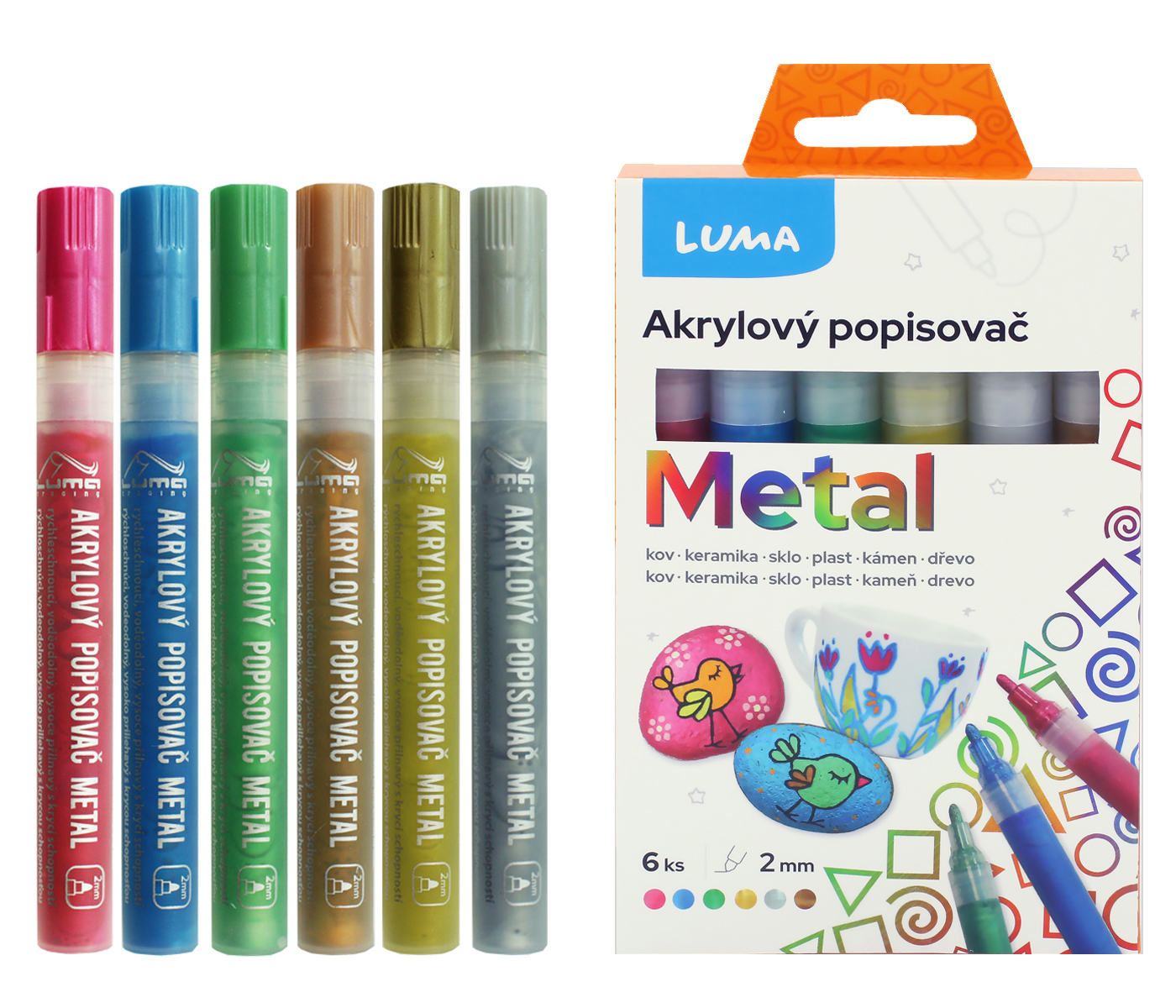 akrylové popisovače- 6 metalických barev v balení- hrot 2mm- 5g inkoustu v popisovači- vhodné na různé povrchy (papír vyšší gramáže, kameny, plátno, dřevěné desky, ...) przeczytaj całość