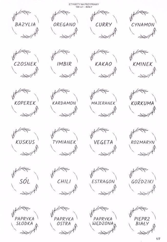 Zestaw naklejek funkcyjnych na słoiki lub inne pojemniki z przyprawami, średnica 40mm. kolor białe przeczytaj całość