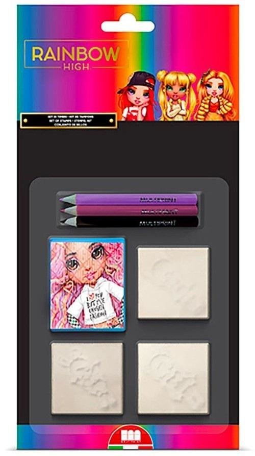 Pieczątki Rainbow High. W skład zestawu wchodzą: 3 drewniano-gumowe pieczątki, 1 poduszeczka do tuszu i 3 kolorowe kredki ołówkowe. przeczytaj całość