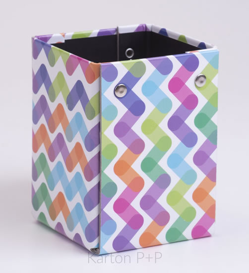 Kelímek na tužky Kelímek na tužky z laminovaného kartonu Nýtovaný, pevný materiál Rozměry: 8 x 8 x 10 cm przeczytaj całość