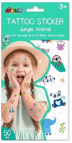 Oryginalny tymczasowy tatuaż dla dzieci, zarówno dla dziewczynek, jak i chłopców, w różnych atrakcyjnych motywach - dżungla. Zabawa dla dzieci oraz ich przyjaciół i rodziny.