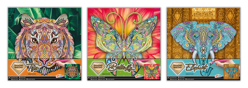 - Wszystko potrzebne w jednym opakowaniu - płótno, zestaw kolorowych kryształków, wosk i ołówek do aplikacji.