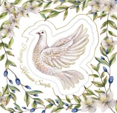 Składany z trzech stron kwadratowy karnet o wymiarach 15 x 15 cm z wyciętym elementem na froncie. Złocony i tłoczony, teksy życzeń w środku. Wydrukowany na wysokiej jakości papierze. W zestawie koperta. przeczytaj całość