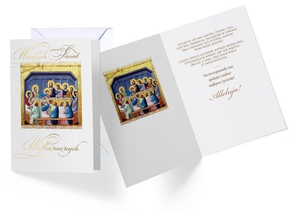 Karnet Wielkanoc Kartka wielkości B6. Karnet wielkanocny, posiada delikatne złote zdobienia. Kartka posiada tekst w środku, dołączona jest do niej koperta. przeczytaj całość