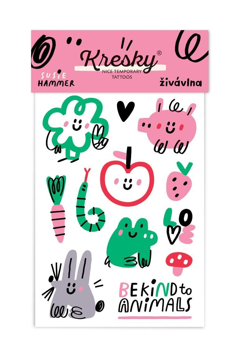 Jaskrawe i urocze ilustracje zwierzątek, owoców i warzyw narysowała ilustratorka Susie Hammer. Przypominają nam, że warto traktować zwierzęta i środowisko z życzliwością. Tatuaże tymczasowe o motywach warzywno-owocowo-zwierzęcych są częścią kolekcji Be kind to animals inicjatywy Živá vlna, która działa na rzecz praw zwierząt i ochrony przyrody z naciskiem na twórczość, zwłaszcza ilustrację i design. Nie stosować tatuażu tymczasowego na skórę wrażliwą, w okolicach oczu ani w przypadku alergii. Testowane dermatologicznie, bezpieczne dla dzieci.