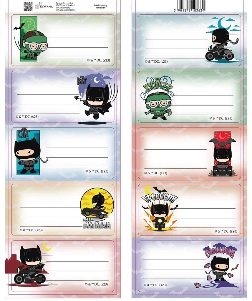 Mix wzorów, towar wysyłany losowo.Naklejki na zeszyty. Na arkuszu znajduje się 10 sztuk kolorowych etykiet z serii Batman. Gwarantują idealny sposób na oznaczenie zeszytów oraz podręczników dla dzieci i nastolatków. 2 wzory. przeczytaj całość