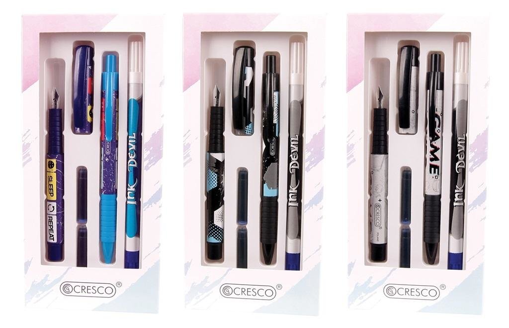 Miks wzorów, towar wysyłany losowo. Cena za sztukę.Zestaw piśmienniczy z serii COLLEGE zawierający pióro + długopis + wymazywacz z korektorem oraz 2 naboje. Całość zapakowane w estetyczne etui. przeczytaj całość