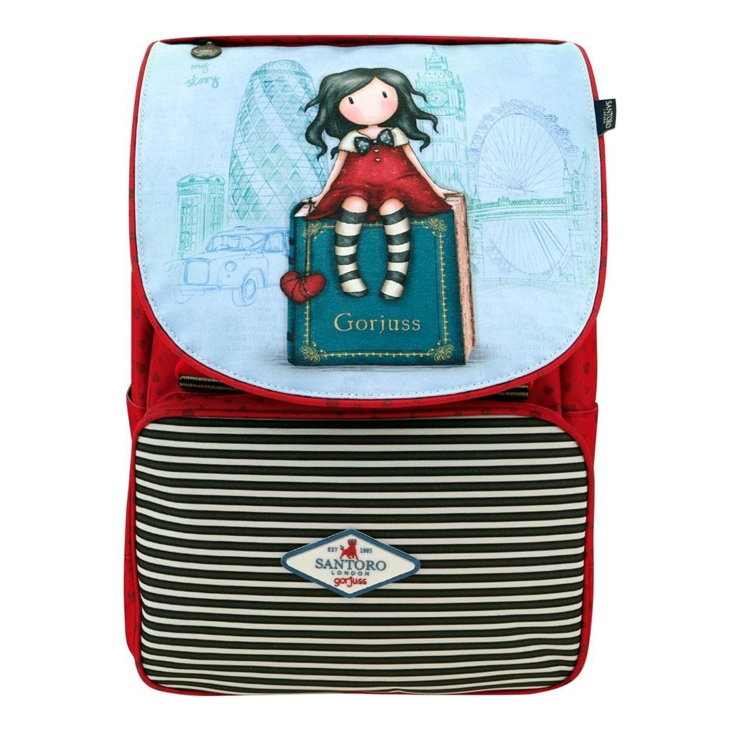 Plecak - Gorjuss - My Story Wyjątkowo praktyczny i duży plecak z wizerunkiem dziewczynka Gorjuss w odcieniach czerwieni rubinowej i głębokiego turkusu. Ma miękkie i wygodne uchwyty do założenia na plecy z regulacją długości. Kieszenie zamykane na suwaki ozdobione medalionami w stylu antycznego...