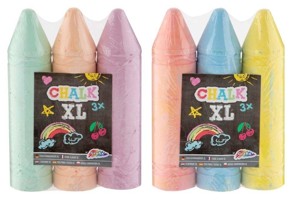 Kredy XL 3 szt. w opakowaniu. Długość kredy 19 cm. Dwa rodzaje - trzy kolory: żółty, niebieski i różowy lub pomarańczowy, zielony i fioletowy. przeczytaj całość