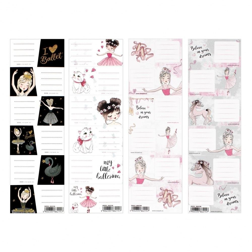 Opakowanie zbiorcze 25 sztuk. Mix wzorów.aklejki dostępne w kilku wzorach Balerina, na listku znajduje się 6 naklejek, naklejki pozwalają na opisanie zeszytów szkolnych, dzięki czemu unikniemy pomyłek przy pakowaniu tornistra do szkoły. Zestaw kolorowych naklejek na zeszyty z wizerunkami...