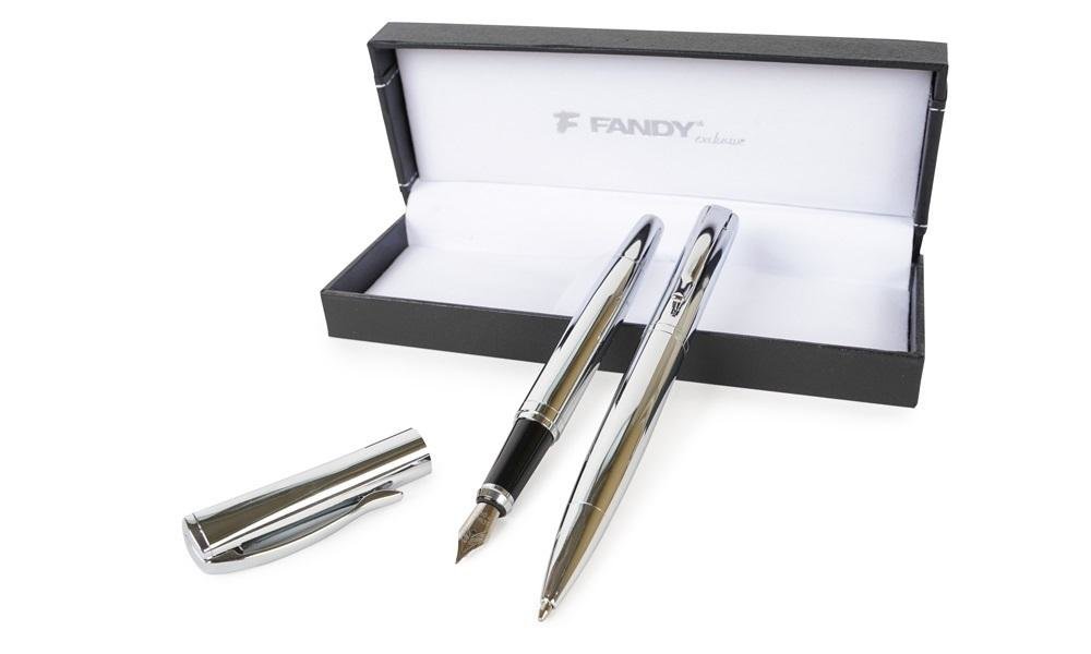 zestaw metalowego długopisu i pióra wiecznego, długopis mechanizm obrotowy, pióro wieczne z wieczkiem, wymienny wkład F-Parker, grubość linii 0,7 mm (długopis), wkłady atramentowe (pióro wieczne), niebieski kolor tuszu, luksusowe pudełko przeczytaj całość