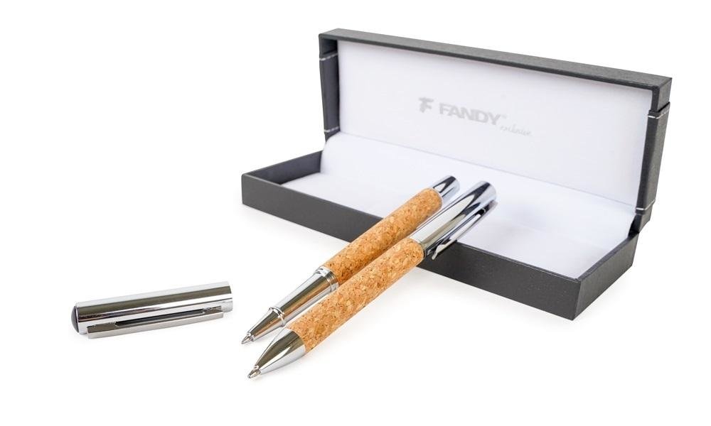 zestaw metalowego długopisu oraz rolleru, uchwyt wykonany z korku, długopis z mechanizmem obrotowym, roller z wieczkiem, wymienny wkład F-Parker, grubość linii 0,7 mm (długopis), Ceramika, grubość linii 0,5 mm (roller), tusz w kolorze niebieskim, luksusowe pudełko przeczytaj całość
