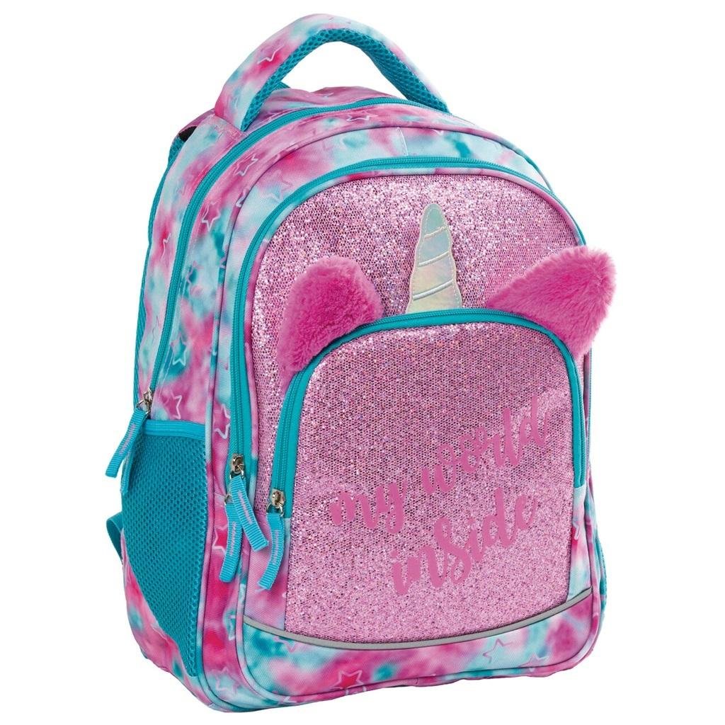Ten plecak z różowymi uszami z futerka i holograficznym rogiem jednorożca to hit sezonu! Przód dodatkowo obszyty różowym, brokatowym materiałem.Wzór: brokatowy jednorożec.Wnętrze:3 komory,2 boczne kieszenie na bidon - w pierwszej komorze 2 dodatkowe kieszenie na laptop i tablet - w przedniej...