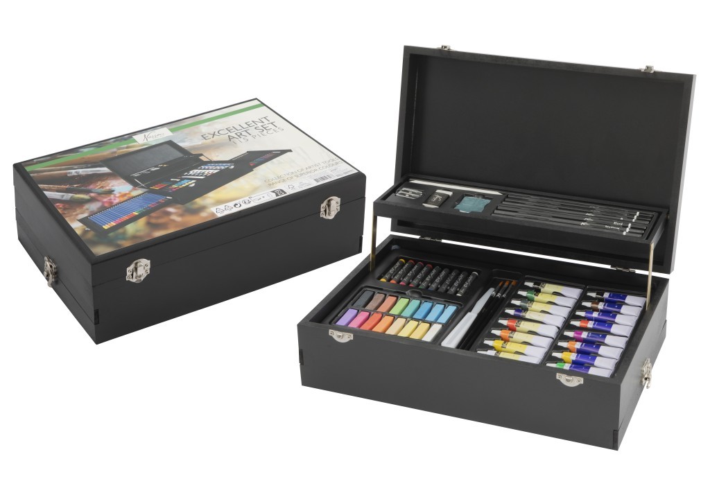 Malířský kufřík patrový Excellent – dřevěný rozkládací, patrový kufřík obsahuje vše pro malíře – barevné křdy, pastelky, baravy, ořezávátko, gumu, štětce atd. celkem 115 ks. przeczytaj całość
