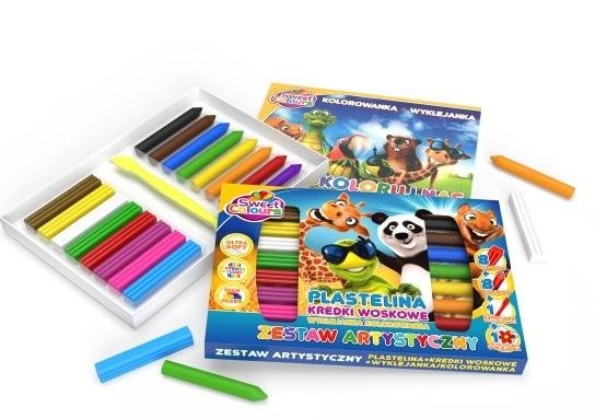 Zestaw artystyczny: 8 kol plastelin, 8 kolorów kredek +10 kart do kolorowania lub wyklejania. przeczytaj całość