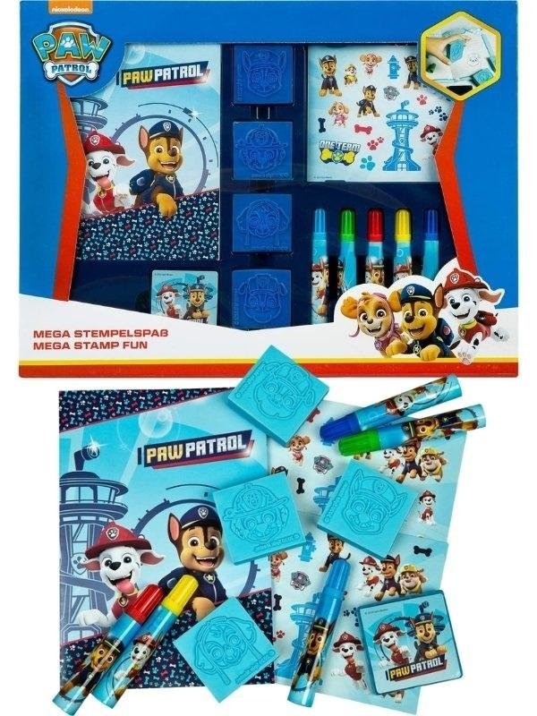 Kreatywny zestaw z ulubionymi postaciami z bajki Psi Patrol. Zawartość: 4 pieczątki, 5 pisaków, 1 notatnik, plastikowe pudełeczko z gąbką nasączoną nietoksycznym tuszem, zestaw naklejek. przeczytaj całość