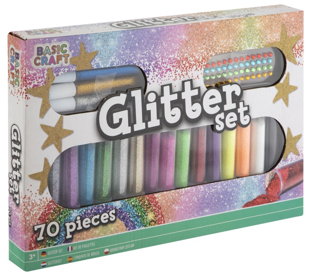 Kretivní sada třpytek – 70 ks. Sada obsahuje 3 tuby třpytivého lepidla, 15 tub barevných třpytek a 52 barevných samolepících kamínků. przeczytaj całość