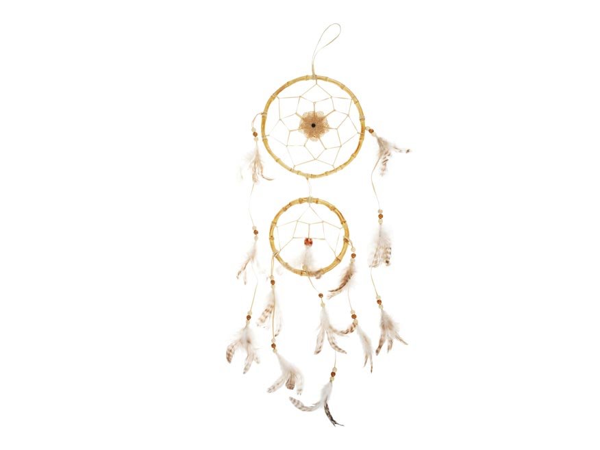 Dekorace lapač snů v bílé barvě. Lapač zavěsíte volně do místnosti nebo nad postel, všechny noční můry se do něj zachytí a do rána budou rázem pryč. Lapač snů má dva kruhy (jeden menší a jeden větší) a kolem nich je omotaný provázek. Z provázku visí bílá peříčka s korálky. Lapač má i provázek na zavěšení.