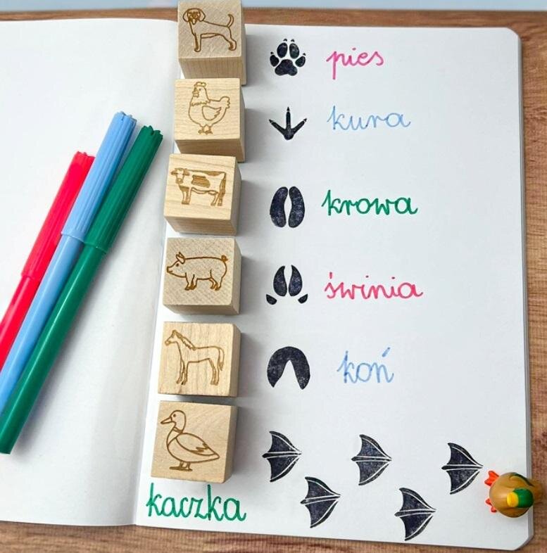 Stemple (pieczątki) ślady na wsi to produkt edukacyjny do nauki przez zabawę.Drewniane, dwustronne pieczątki z tropami zwierząt występujących na wsi. Z jednej strony stempla znajduje się postać zwierzaka a z drugiej jego trop (ślad). Pieczątki są idealnym sposobem aby zainteresować dziecko...