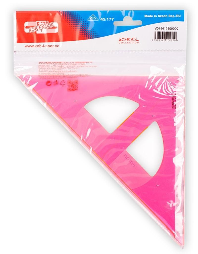 Trójkąt 45/177 z oznaczeniem do konstruowania prostopadłych, wykonany z różowego, przezroczystego polistyrenu. Podziałka została wykonana techniką tłoczenia na gorąco. Dokładność podziałki: 0,2% długości. Oprócz podziałki długości posiada również kreskę do konstruowania prostopadłych. Trójkąt przeznaczony jest do rysowania i rysunku technicznego w szkole i w biurze. Zapakowany jest w polietylenowy woreczek z eurozawieszką.