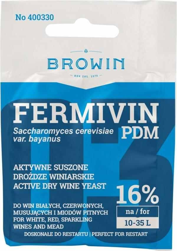Fermivin PDM to specjalnie wyselekcjonowany szczep drożdży winiarskich pochodzący z regionu Szampanii we Francji - ceniony „bayanus”, który zapewnia szybką i stabilną fermentację w bardzo szerokim zakresie temperatur, nawet w trudnych warunkach. Doskonale nadaje się do produkcji miodów pitnych. Wzmacnia aromat wina, dzięki czemu uwydatnia aromat owocu, z którego powstaje napój. Idealny do ponownego fermentowania - stosowany, gdy fermentacja ustaje przed osiągnięciem założonych parametrów.