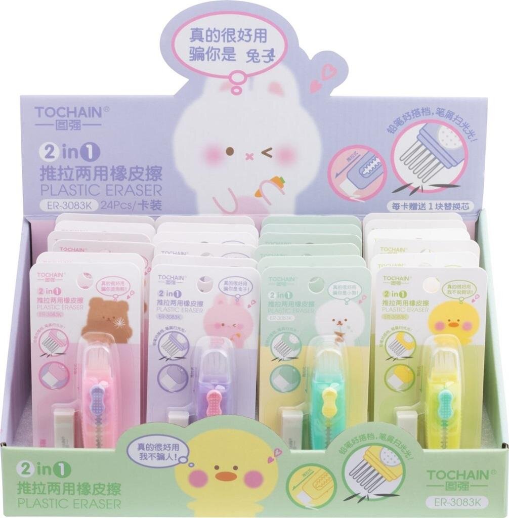 Gumka wysuwana z dodatkowym zapasem oraz pędzelkiemułatwiającym usuwanie zużytej gumkiPraktyczna blokada ułatwia utrzymywanie gumkiw prawidłowej pozycjiKształt prostokątnyNie zawiera ftalanów i lateksuWymiary gumki: 47 x 8 x 10 mmCztery pastelowe kolory obudowy24 szt. w displayu przeczytaj całość