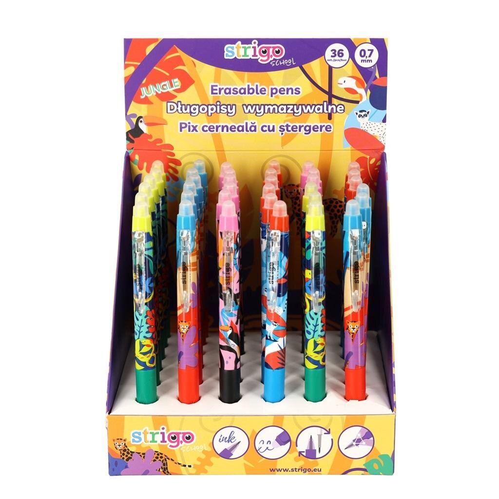 Wymazywalny, automatyczny długopis STRIGO. Wyposażony w trójkątny, ergonomiczny uchwyt, który zapewnia komfort użytkowania i naukę chwytu. Zakończony gumką, która umożliwia estetyczną korektę napisanego tekstu. Wystarczy potrzeć napisany tekst i bez użycia korektora, możemy poprawić błędy. Średnica końcówki piszącej 0,5 mm. W display u 36 sztuk. Kolor wkładu: niebieski.