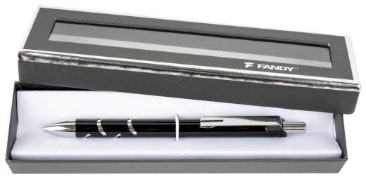 metalowy długopis automatyczny ze srebrną błyszczącą końcówką i klipem, wymienny wkład F-411, niebieski kolor tuszu, grubość linii 0,7 mm, pudełko upominkowe przeczytaj całość