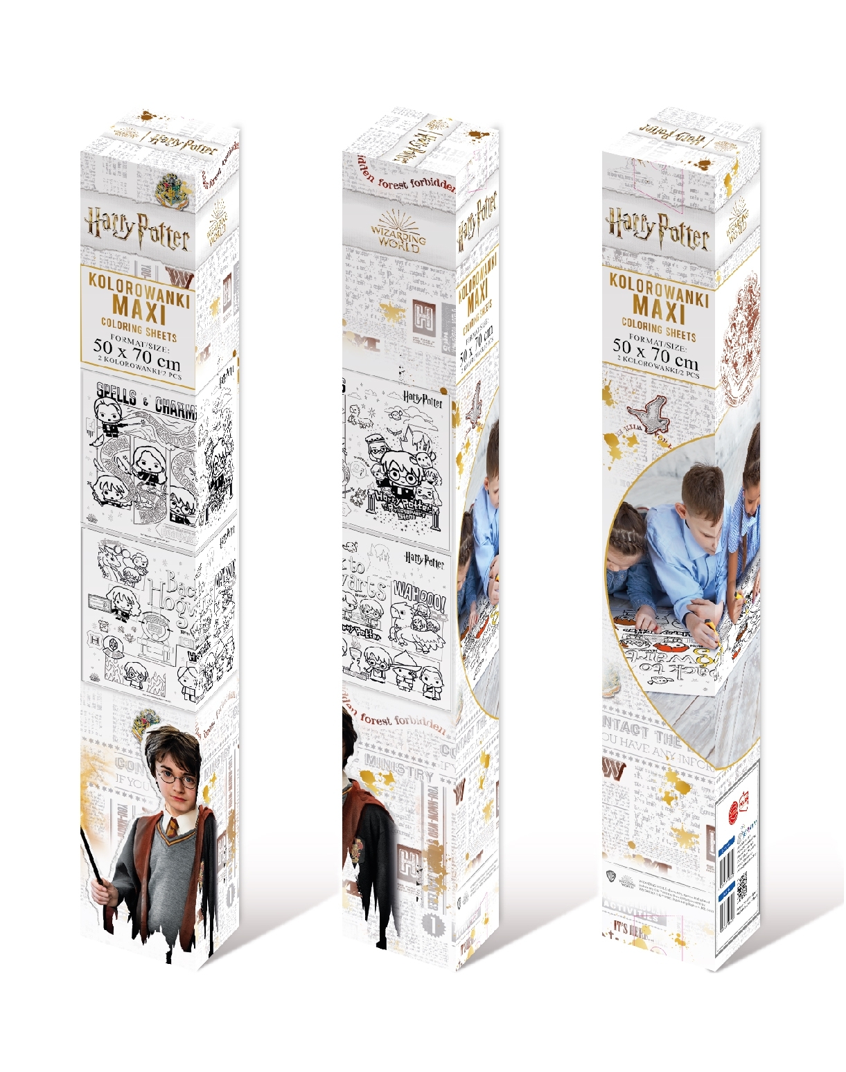 Wielkoformatowa kolorowanka wykonana z grubego, białego papieru. Możliwość pracy kilku osób jednocześnie. Profesjonalna grafika, wyraźny druk w kolorze czarnym. Rolowany bez zagnieceń. W tekturowej tubie chroniącej przed zniszczeniem. Odpowiedni do kolorowania kredkami, flamastrami, markerami i farbami. Na kolorowance znajdują się ulubieni bohaterzy z serii Harry Potter.
