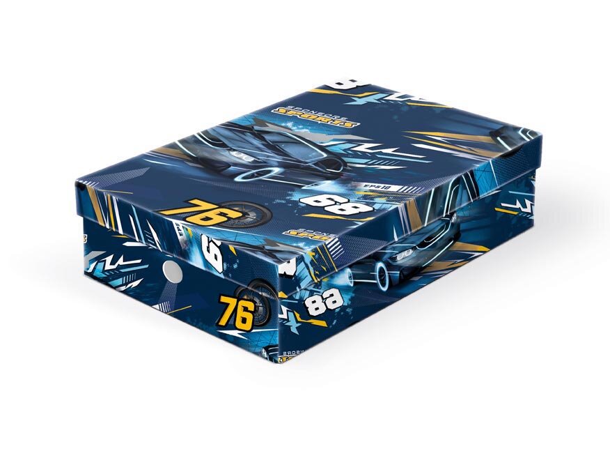 Szkolne pudełko z kartonu, z motywem samochodu. Nadaje się do przechowywania niezbędnych materiałów na zajęcia plastyczne lub innych szkolnych przyborów. Do pudełka mieści się format A4.
