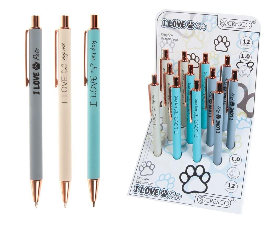 Wyjątkowy długopis z nadrukiem dla miłośników zwierząt - I LOVE PETS. Wykończenia różowe złoto. Korpus: powierzchnia softowa. Długopis wyposażony został w wymienny wielkopojemnościowy wkład typu zenith o grubości 1mm linii pisania. W opakowaniu mix 12szt w trzech kolorach oraz z trzema... przeczytaj całość
