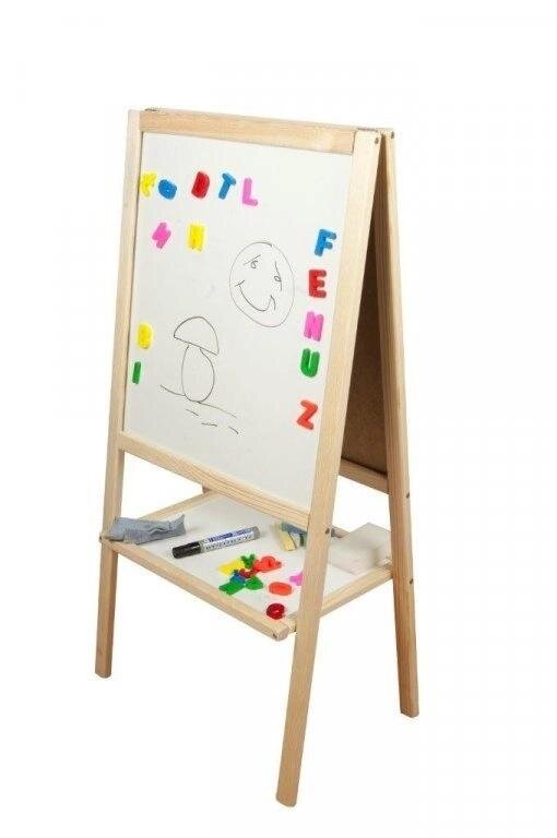 Magnetyczna dwustronna tablica drewniana- naturalna, rozkładana. Wyposażona w zegar (ruchome wskazówki) i alfabet. Gąbka, kreda. Tablica zawiera marker.Rozmiar produktu(dł x szer x wys) cm37 x 45,5 x 90 przeczytaj całość
