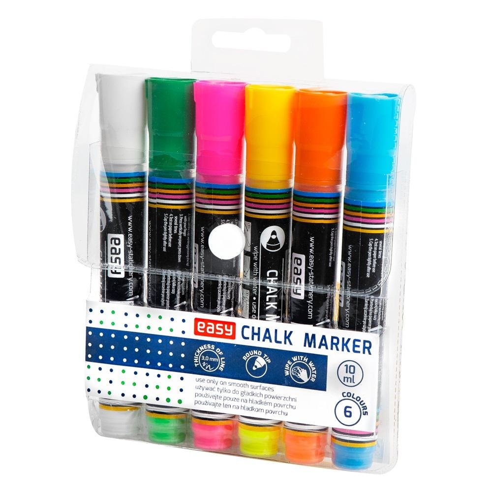 Wygodne markery kredowe. Konsystencja tuszu pozwala na łatwe ścieranie markera z płaskich powierzchni. Intensywne kolory umożliwiają urozmaicanie otaczającej przestrzeni.